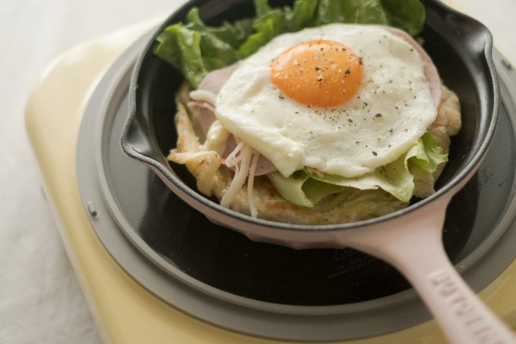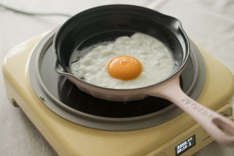 小煎锅内刷上一层薄油,电磁炉自由烹饪模式火力2档,加热半分钟后,倒入一整个鸡蛋,调整为1档火力,慢煎5分钟左右即可
