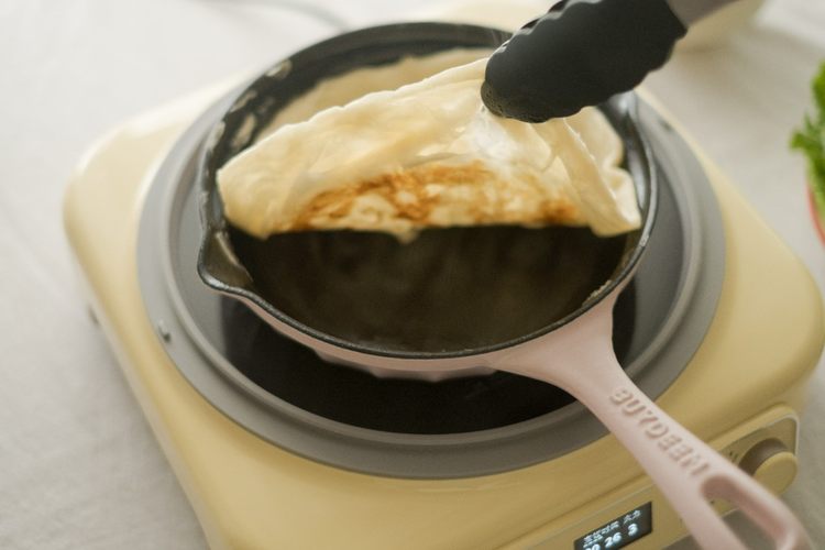 煎手抓饼的时候,选择自由烹饪火力3档模式,将手抓饼煎至两面微微发黄即可,参考时间:每面煎2-3分钟,结束程序
