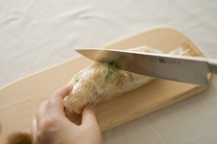 用保鲜膜把手抓饼包裹住卷起来,用刀从中间部分斜切成两份