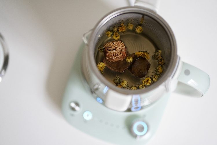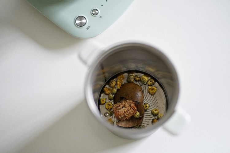 罗汉果洗净切开,取1/4个(含果壳、果肉)与小胎菊一起放入快食篮