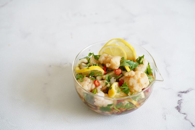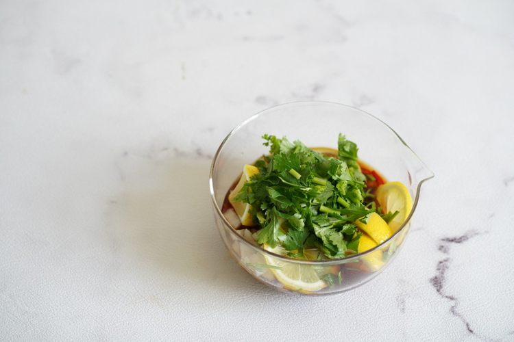 小米辣、洋葱、香菜切碎,柠檬切片去籽与调料混合