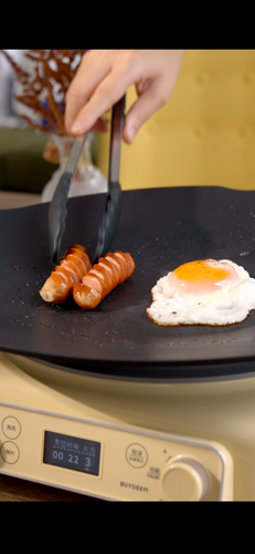 等待松饼出炉的时间,将北鼎烤肉锅放上北鼎电磁炉,自由模式火力3,将培根、脆肠和鸡蛋煎好