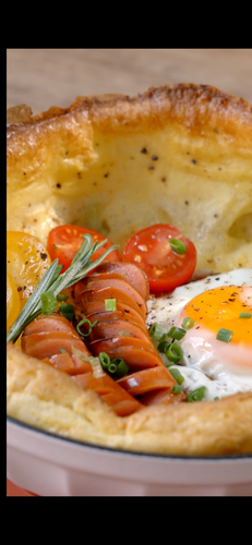 烤箱取出已预热铸铁锅,面糊倒入18cm铸铁锅送回烤箱中烘烤15分钟。松饼会在烤箱里慢慢膨胩,出炉后会塌陷是正常的哟