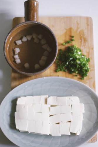 将干贝洗净用清水浸泡,鲜豆腐切小块备用。