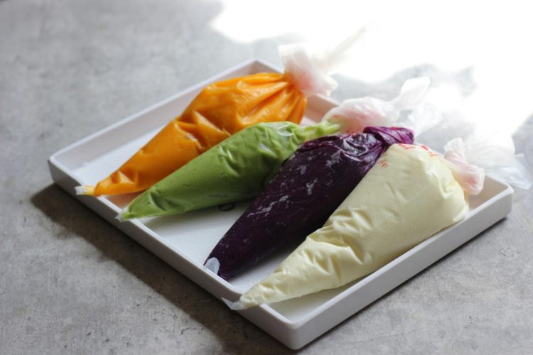 把芒果,牛油果,蒸熟的紫薯【紫薯对半切开,选择快蒸功能,时间15分钟即可】分别打成泥,装进裱花袋中,酸奶也装进裱花袋中,方便操作