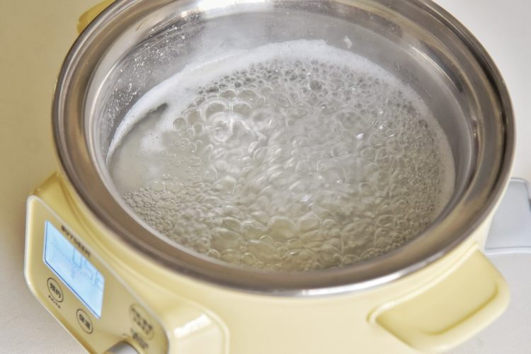 将海鲜清洗处理干净。锅中加入大米和水,开启「快煮」功能,时间30分钟