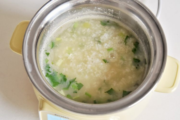 待程序剩余5分钟时,向锅中加入芹菜碎和盐,搅拌均匀,程序结束即可享用海鲜粥