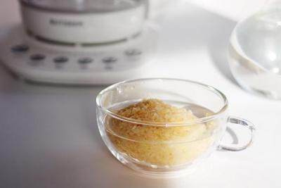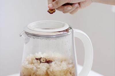 将撕碎的银耳、桃胶放入壶内,加水至1000ml,启动【温泡】与【银耳/滋补汤】模式。