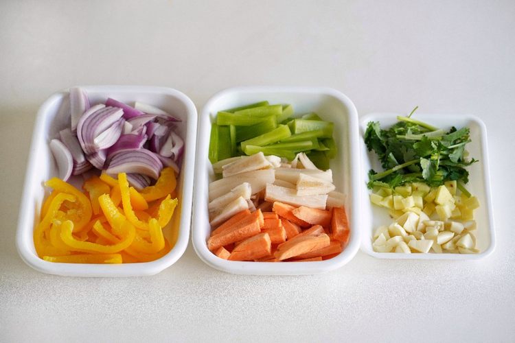 红薯、藕,莴笋、香菜切段,彩椒、洋葱切块。大蒜、姜切成小粒