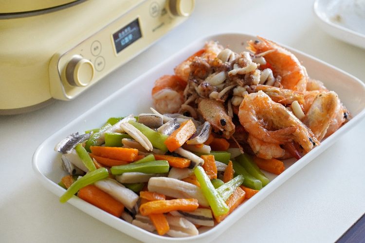 再将虾与鱿鱼须倒入,炸3分钟后捞出沥油待用。