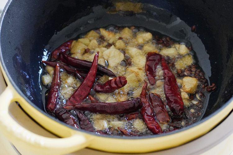 锅内留约20g底油,下大蒜、姜粒、干辣椒、花椒翻炒3分钟爆香