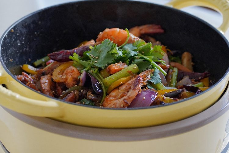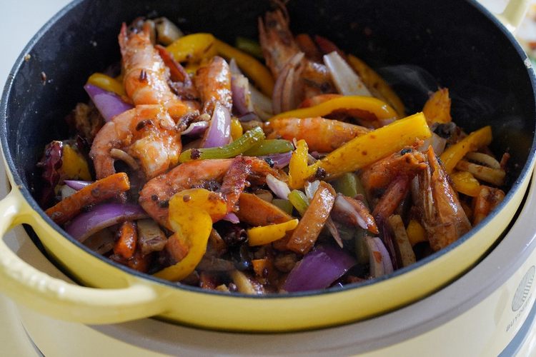 加入郫县豆瓣酱炒2分钟炒出红油后,倒入炸过的食材和青红椒、洋葱一起翻炒5分钟