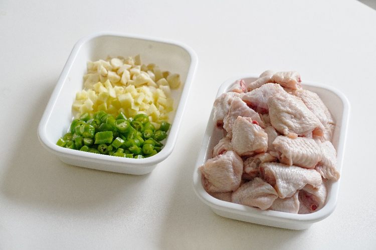 鸡翅洗净,对半切开。大蒜、辣椒、姜切成小粒待用。