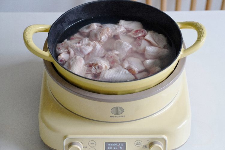 鸡翅冷水下锅,电磁炉自由模式4档火力加热,8分钟鸡翅焯熟后捞出待用。