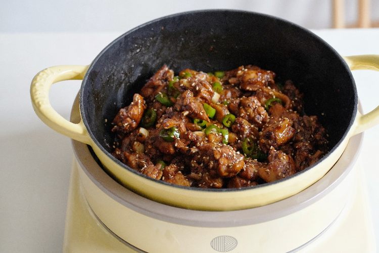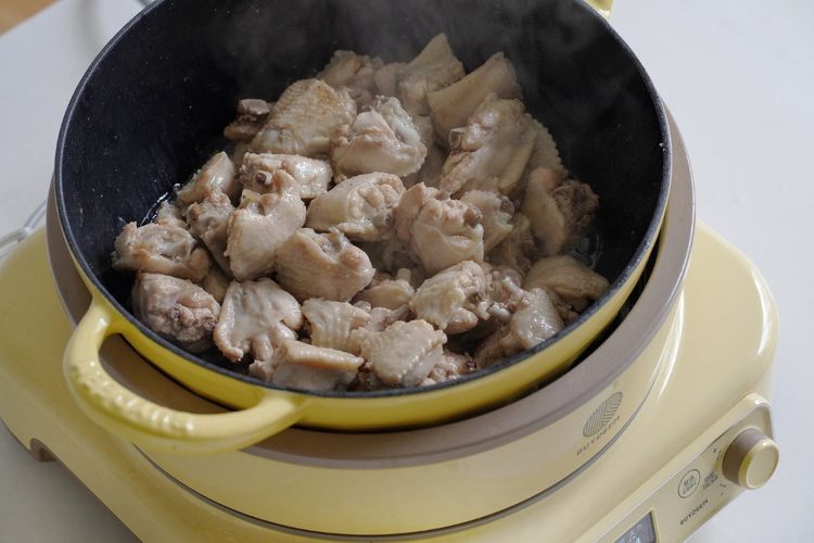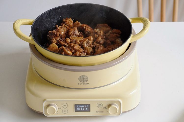 炖烧锅锅内倒入食用油,电磁炉4档自由模式加热2分钟至油热后,倒入鸡翅翻炒3分钟
