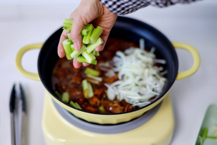 加入洋葱和芹菜,翻炒均匀继续煮20分钟,开盖稍微收汁,就可以开始吃了。
