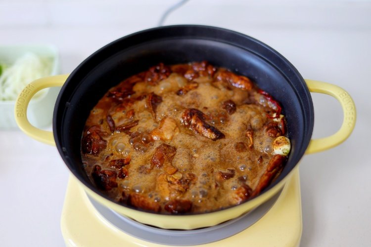 放入腌制好的鸡腿和鸡翅,将腌制的卤酱一起倒入,翻炒3分钟至变色,倒入一罐啤酒,煮沸后改成1档火力,盖上锅盖焖煮20分钟。