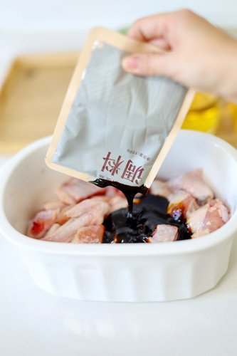 把鸡腿、鸡翅改刀成一口大小,鸡腿可不去骨,加入五香辣卤酱搅拌均匀,腌制1小时。洋葱切丝,芹菜改刀切成5厘米左右的段。