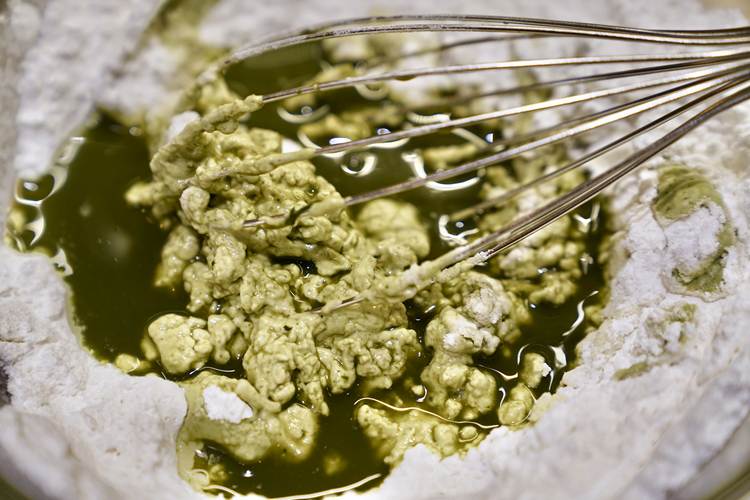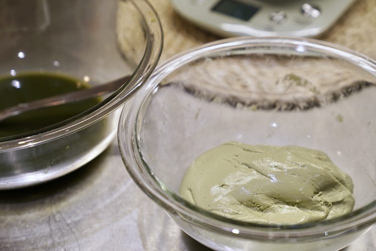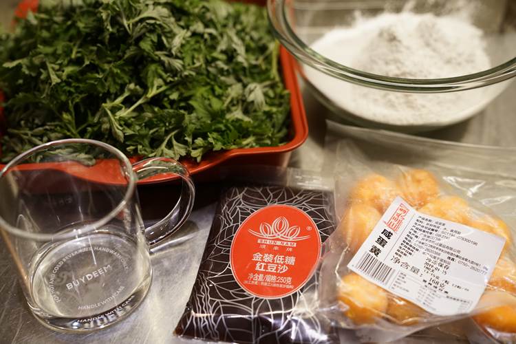 把糯米粉、粘米粉、澄粉、糖和艾草汁混合成团。