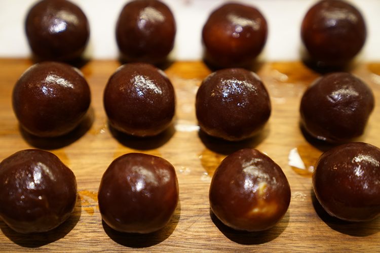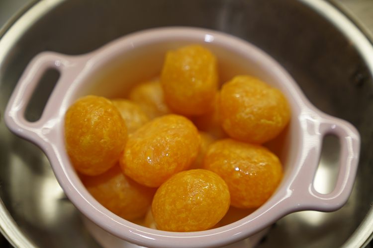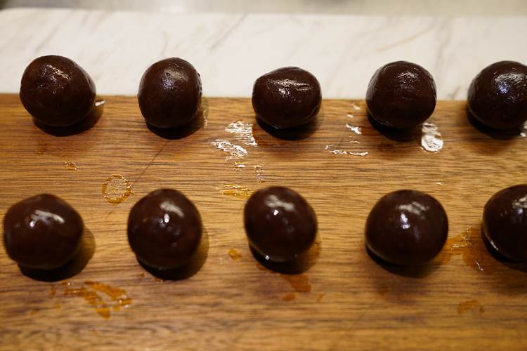 12个豆沙球,分别包入咸蛋黄,做成馅,每颗约40-43克。