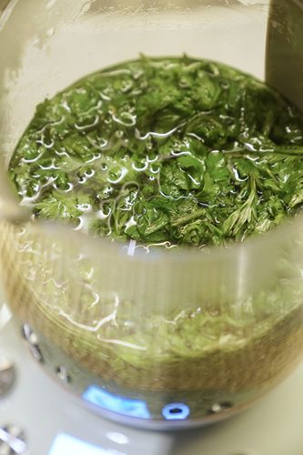 沥干的艾草挤干水份,加入400ml水,用料理机打成泥。滤出330ml的艾草汁备用。