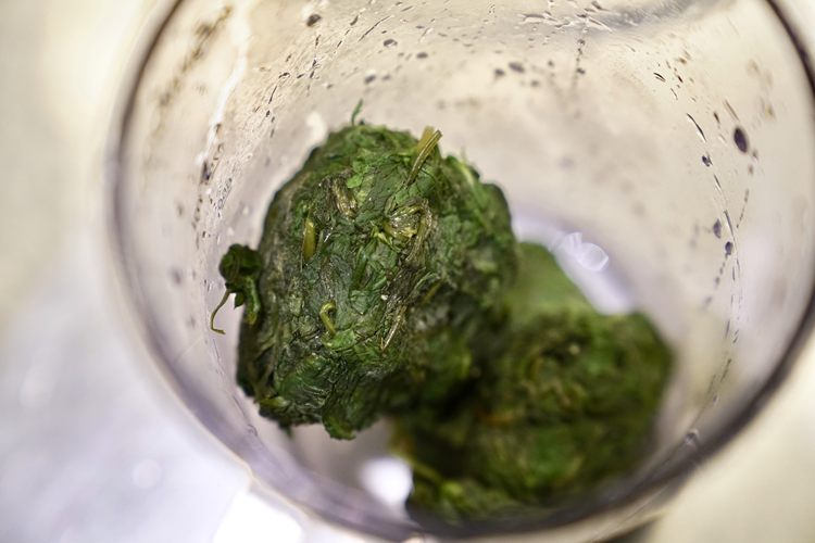 把洗净的艾草,分次在滚水里氽煮后撩起沥干。