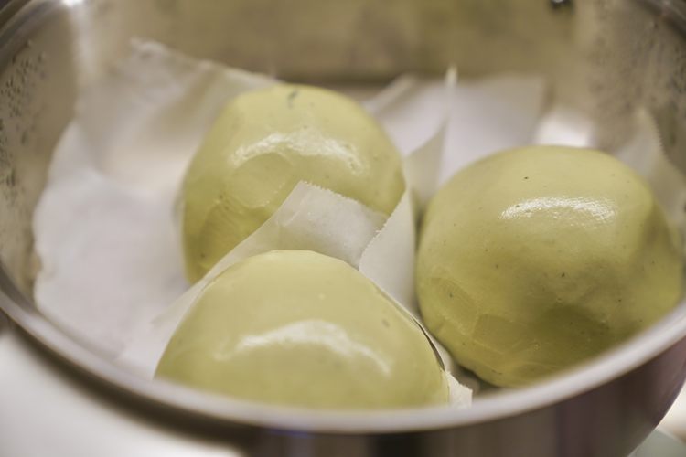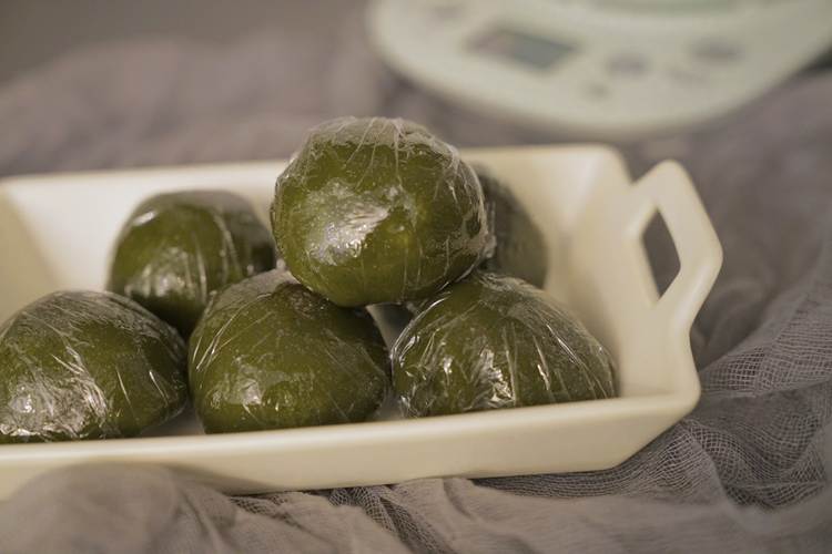艾草面团成团后,用手揉光滑。分成12个小面团。
