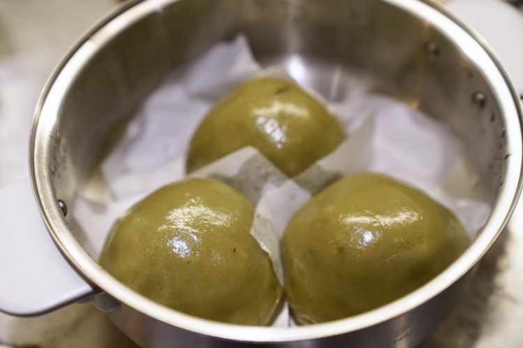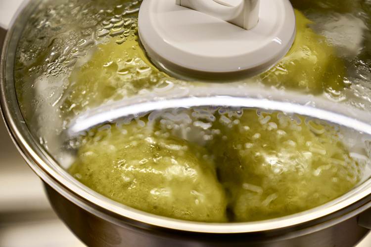 蒸煮的间隙,看到青团鼓包可开盖透气再盖上。这样做可以防止青团塌陷。