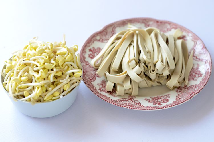 处理配菜:豆皮切段、豆芽淘净、番茄洗干净.