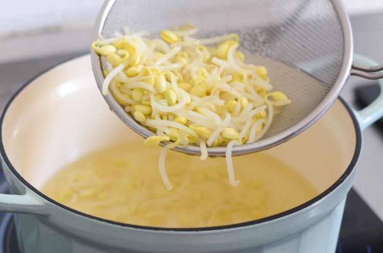 先烧一锅水把豆芽焯一下断生、番茄顶部切十字烫一下后,揭掉外皮。
