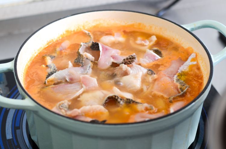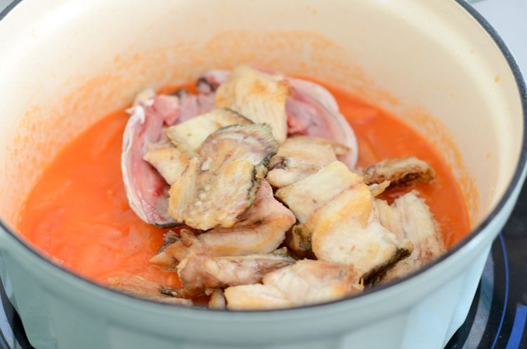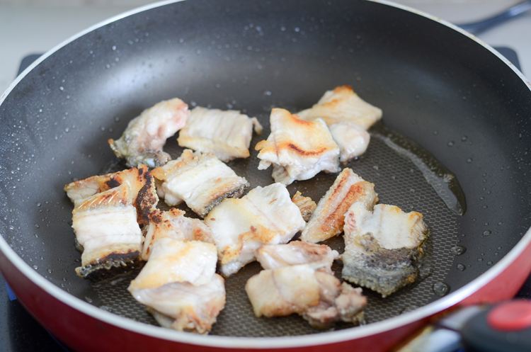 热锅倒入少许油,把鱼骨鱼头煎至金黄。