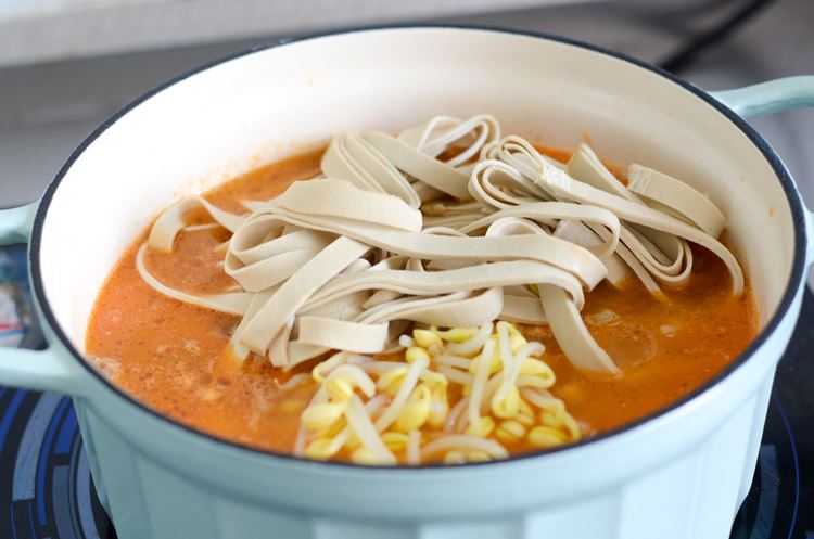 加入大半锅水继续煮,汤滚后下配菜豆芽豆皮。