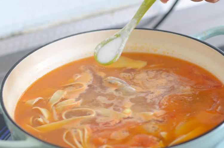 打开电磁炉放上珐琅锅,把番茄肉切丁后倒进去,不断翻炒至软烂出汁,再挤入一些番茄酱。