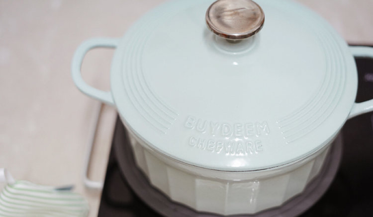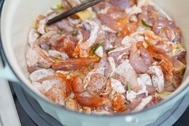 中火加热铸铁锅,下点油,鸡腿肉的皮尽可能地朝下,先煎一煎,再反过来,两面煎金黄。