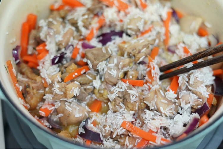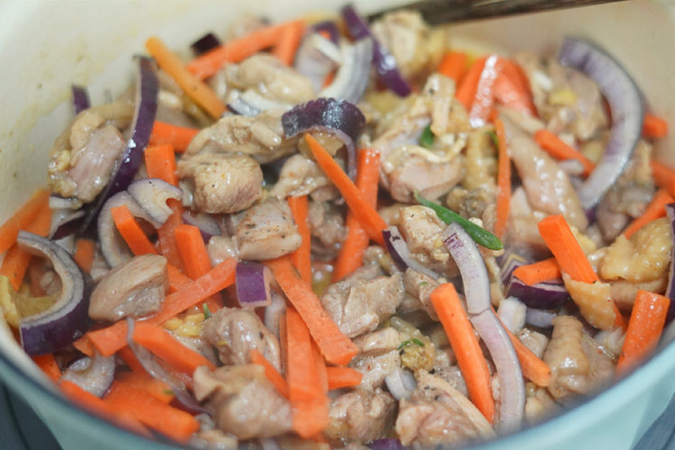 看洋葱有点变色,下泡好的米,翻一翻,下大概一杯的开水。