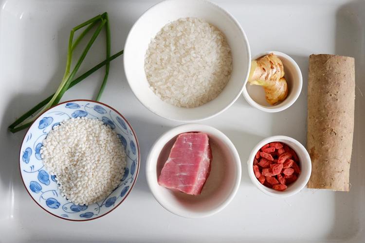 将瘦肉片,加入盐和白胡椒粉和生粉抓匀,山药去皮切块,生姜切丝,小葱切段。