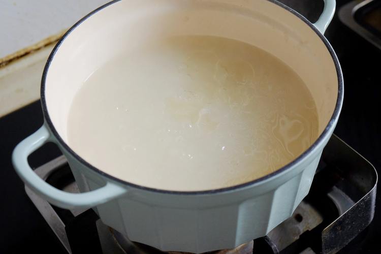 将大米和糯米洗净,加入800ml水和一勺油,中火煮沸转至小火煮20分钟。