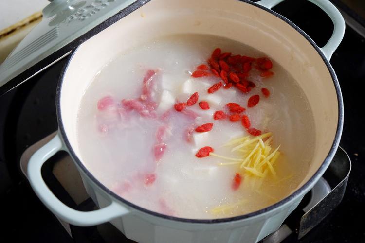 再加入瘦肉、生姜丝和枸杞再煮10分钟。
