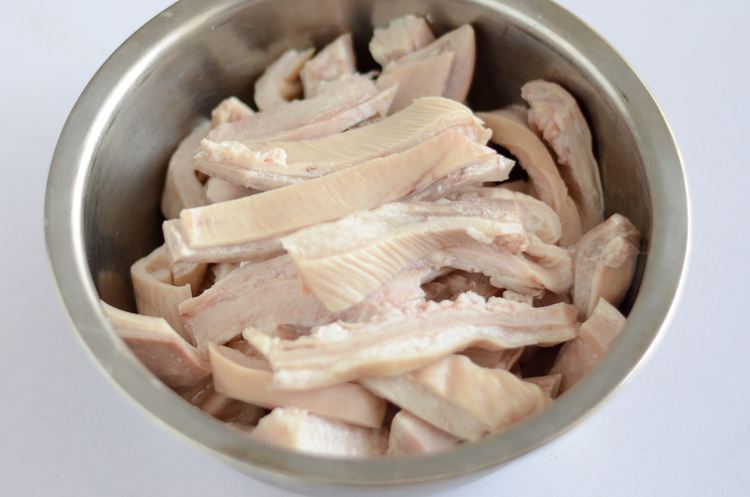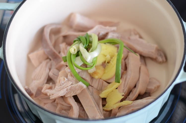 锅内放入猪肚条,码上姜片、葱结和花椒粒。