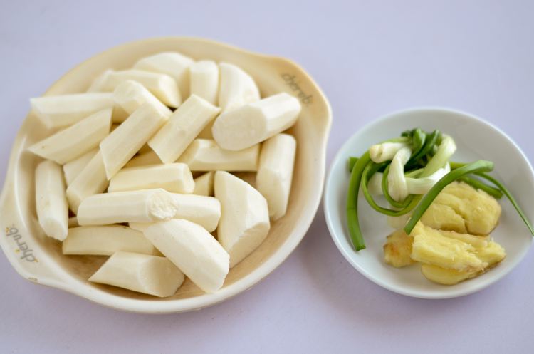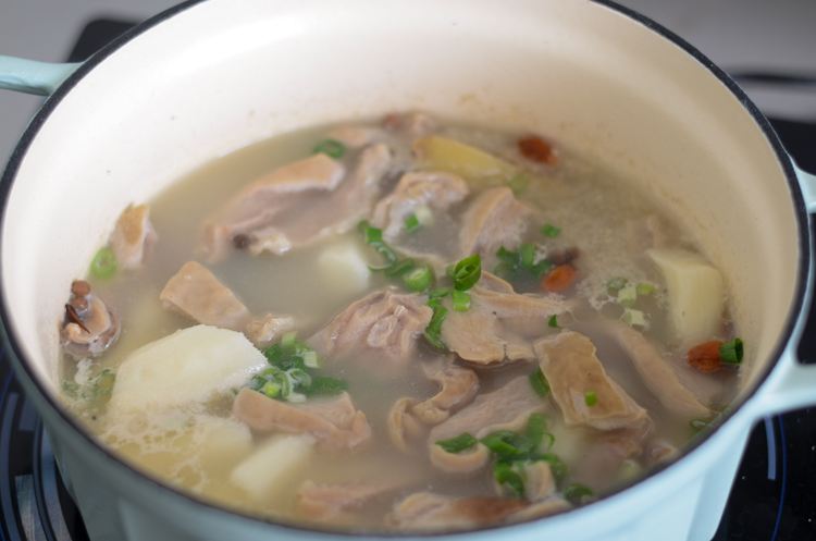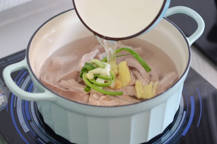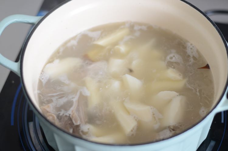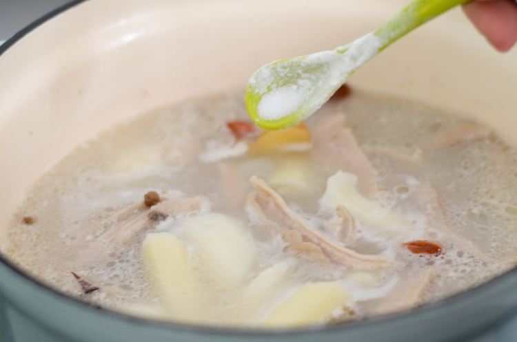 先炖两个小时,然后捞出葱结扔掉,倒入山药条和枸杞再炖20分钟。