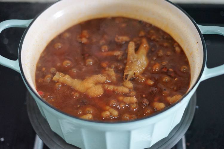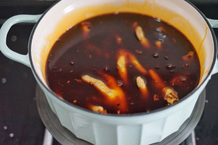 卤鸡爪的底料其实类似于四川火锅的清油火锅底料,只是为了方便,我们不再分开炒底料和红油了。让鸡爪软糯,并且入味到骨头的关键是用一口密封度好又微微带有压力的锅子,北鼎珐琅锅就很适合。