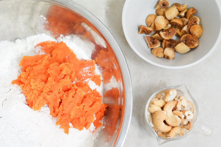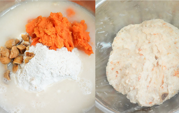 酵母用不超过40°的温水化开。面盆里放入高粉,全麦粉,红薯泥,无花果干,水,因为面糊水量大,可用刮刀揉匀盖上保鲜膜,室温22度左右静置半小时,如果温度高可缩短时间。