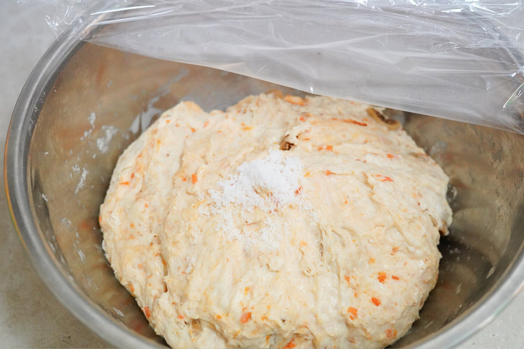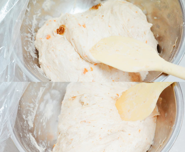 开始进行4次每隔半小时的折叠,一共2个小时,在这个过程完成第一发酵。将面团从底部捞起,上下左右折叠,再盖上保鲜膜室温静置半小时,以上这些过程有利于形成面筋。