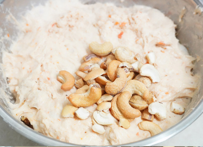 在最后一次折叠时,加入坚果仁,上下左右折叠后,盖上保鲜膜静置0.5-1小时,面团发酵到1.5倍大,就完成第一次发酵了。
