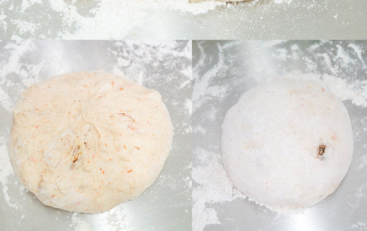 一发完成开始排气整形。面团倒在铺了面粉的台面,双手擦粉,轻轻拍扁面团排出气体,然后上下左右地折叠。最后把收口处捏紧,将面团倒过来收口朝下,表面拍粉,往下收圆。