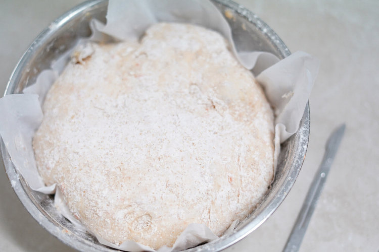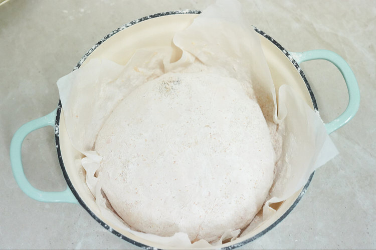 铸铁锅里铺上油纸,将面团收口朝下放入锅内,盖上锅盖。开始第二次发酵。可烤箱30度发酵30-45分钟,季节室温高时应缩短烤箱内发酵时长。或选择放入冰箱冷藏发酵一夜。