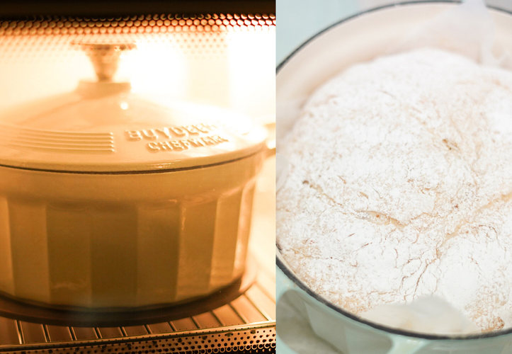 另一边将珐琅铸铁锅放入烤箱,230度半小时。而后拿出,将发好的有2倍大的面团,连着油纸放入锅中,注意锅超级烫手,要带着隔热手套哦。放入锅前也可以撒粉给面团表面用刀片划花纹。