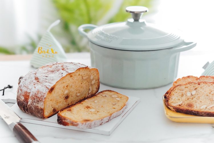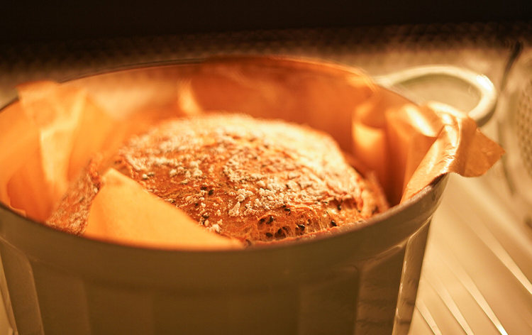 继续整锅带盖送入烤箱,230°烤30分钟,然后拿出锅盖,继续烤15-20分钟,给欧包表面上色。