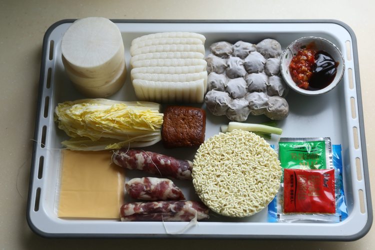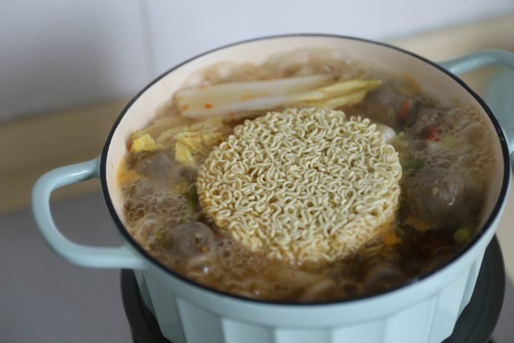 煮开的汤里放入年糕,白菜心,方便面料包,再放入方便面盖上锅盖煮1分钟。