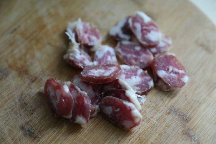 萝卜切块,香肠切片(香肠可选任意品种),香干切片待用。